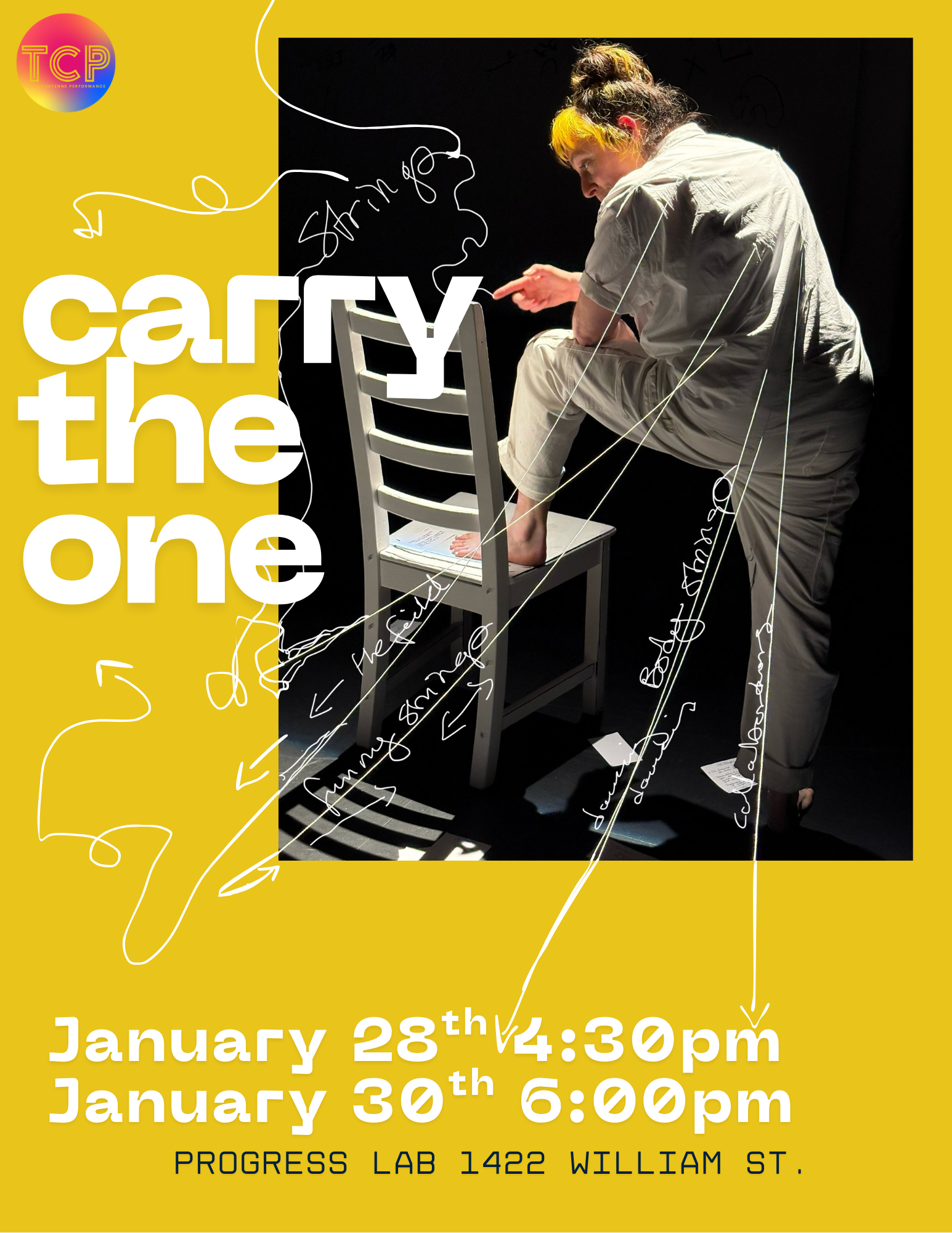 Carry The One is a performance lecture featuring Tara Cheyenne Friedenberg rewilding the self. The "lecture" winds through a performative practical exploration of emotional labour, filtered through a middle-aged femme body that's in the process of trying to shed the chronic debilitating imposition to take care of the atmosphere, the group, the mood, and the needs of literally everyone else.